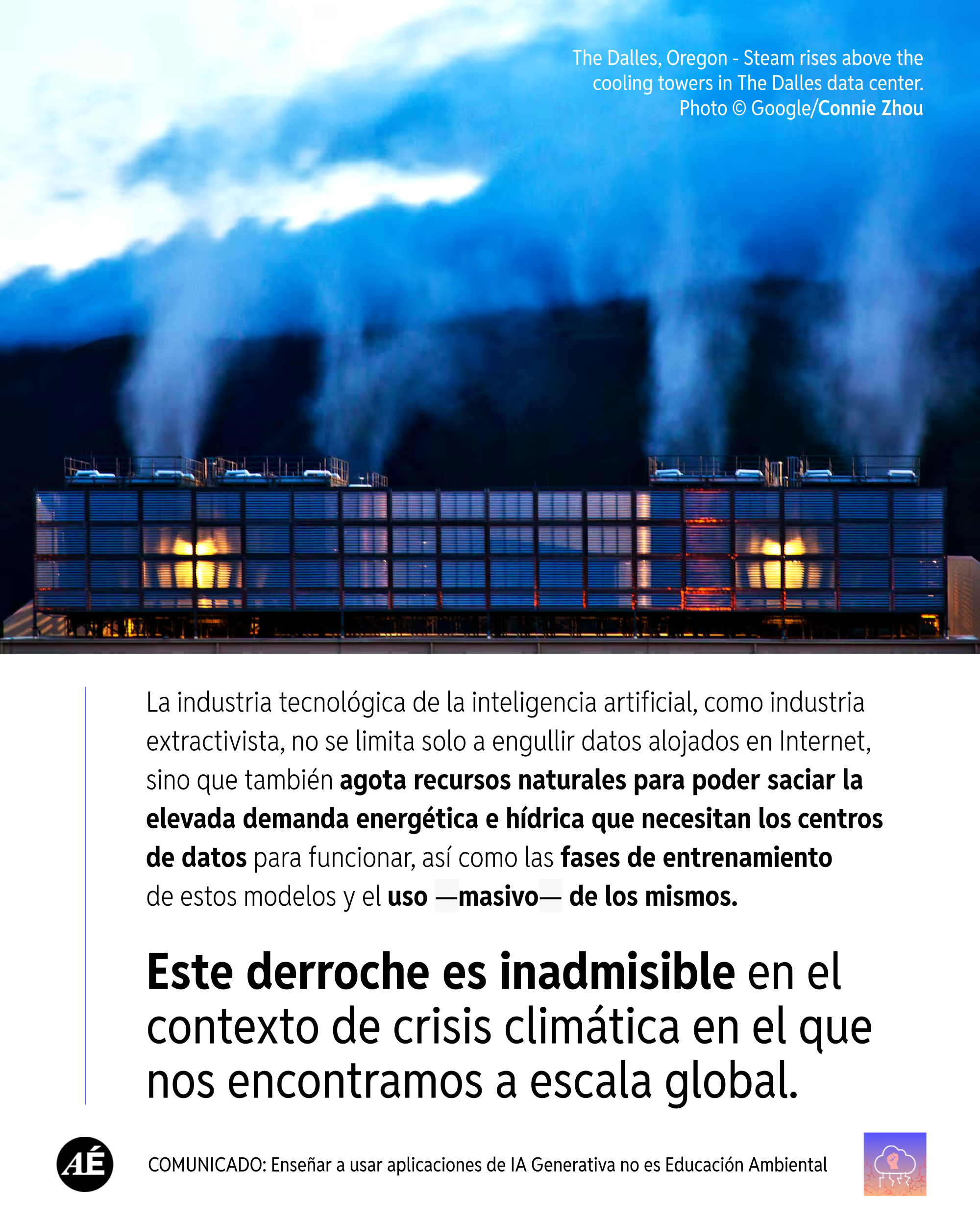 Es inaceptable que se imparta esta formación en un contexto de crisis climática como el actual. ¿Cómo puede construirse un mundo mejor enseñando a utilizar modelos comerciales de IA generativa que vulneran derechos y contribuyen a agravar el cambio climático?